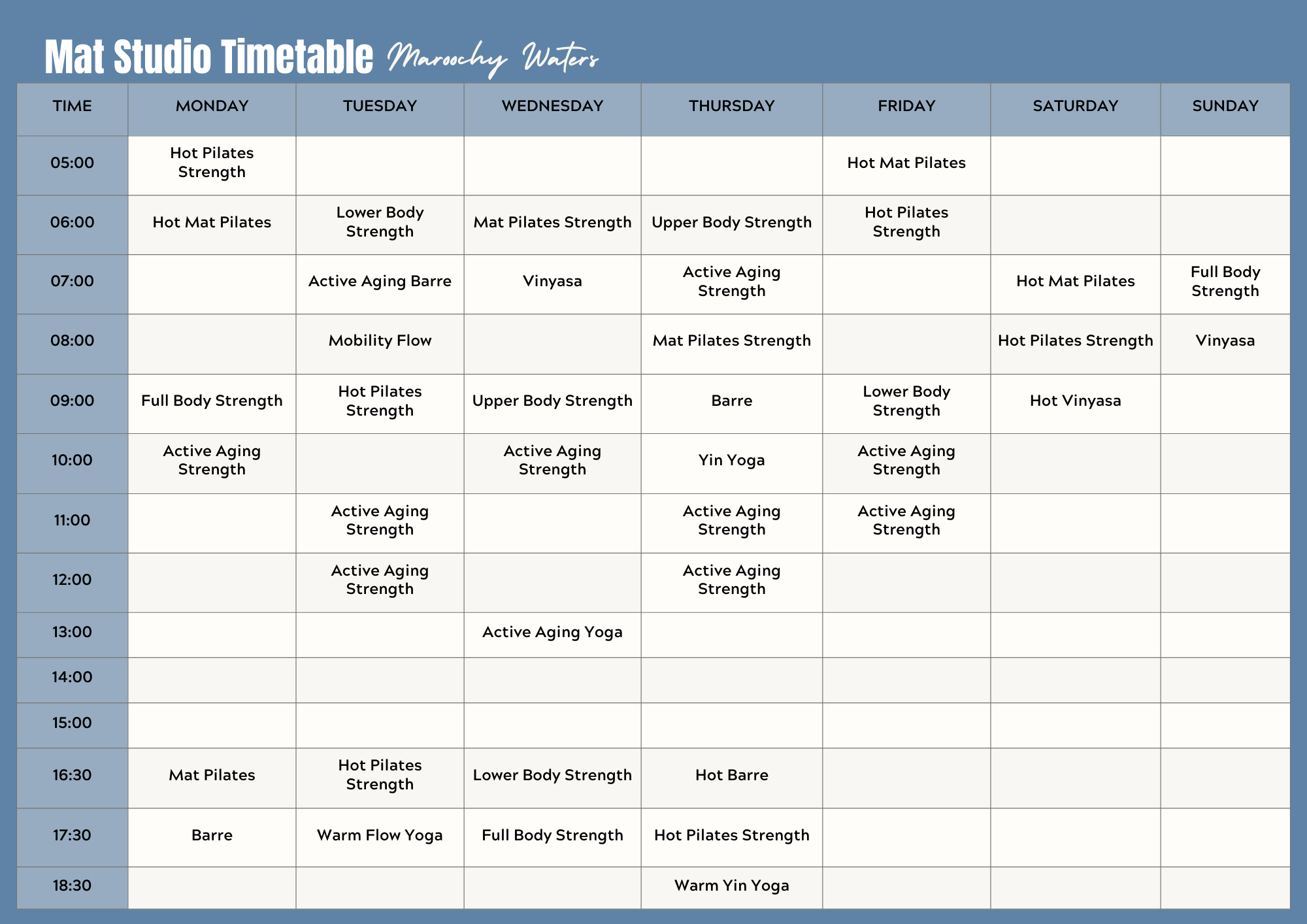 Heated and non- heated Mat Pilates strength classes in the Maroochy Waters mat studio.